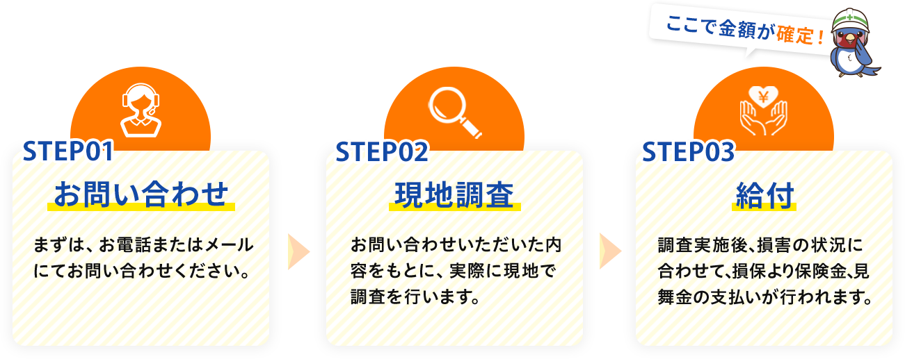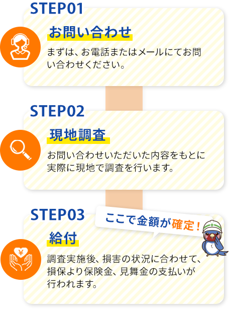 ※大まかなステップの説明であり、ご加入の火災保険の内容により調査の流れは変わる場合がございます。